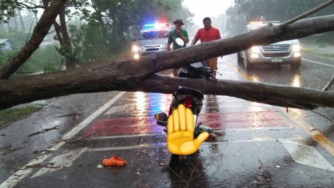 นึกภาพไม่ออกคนเจ็บจะเป็นไง..ต้นไม้ใหญ่หักโค่นล้มทับรถจักรยานยนต์แบบนี้(ตามภาพ)