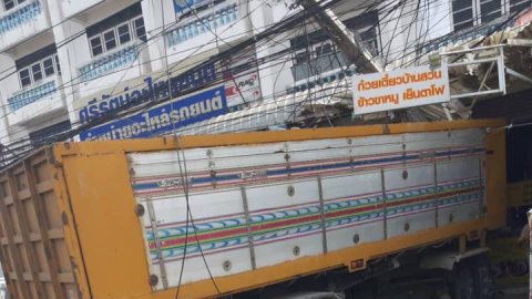 รถพ่วง 18 ล้อ เสียหลักชนรถหลายคันก่อนพุ่งเข้าชนอาคารพาณิชย์
