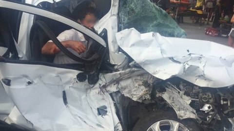สิบแปดล้อชนท้ายสิบแปดล้อมีผู้เสียชีวิตติดในรถต้องตัดถ่างออกมา