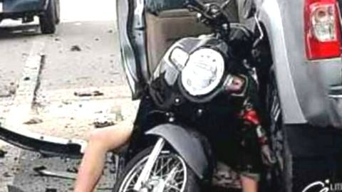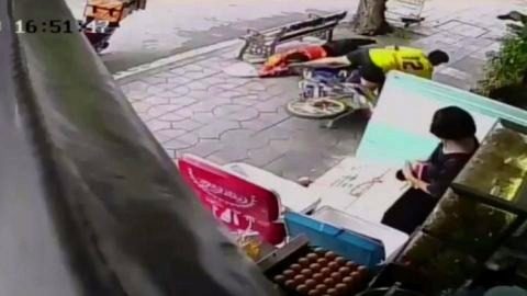 หนุ่มใหญ่ซื้อราดหน้าโดนจักรยานยนต์พุ่งชนกลิ้งฟุบบนฟุตบาท