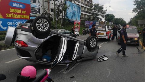 เกิดเหตุ..เก๋งหักหล่บจักรยานยนต์ พลิกคว่ำ
