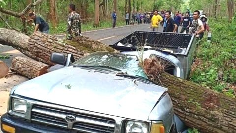 เหตุเกิดวันนี้ ต้นไม้ยักษ์ล้มทับรถกระบะเละทั้งคัน จ.ลำพูน