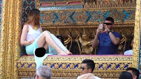 ฉาวอีกแล้ว! ฝรั่งสาวปีนระเบียงวัดพระแก้ว โพสต์ท่าหอยโผล่ให้เพื่อนถ่าย ไม่สนใจป้ายห้าม