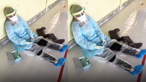 เผยภาพหมออนามัยหญิง เพลีย นั่งพื้นหลับ คาชุด PPE (แบบประยุกต์ใช้เอง)