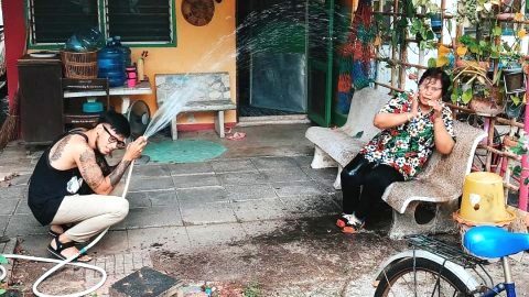 ฮาหนักมาก! เผยภาพ รดน้ำดำหัวแม่ แบบ social distancing ในช่วงโควิดระบาด