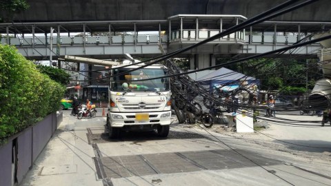 ดูแล้วยุ่งเหยิง สายไฟไทย !! รถโม่ปูนเกี่ยวสายสื่อสารเสาไฟฟ้าล้มทับ