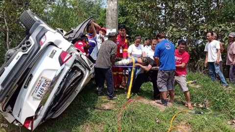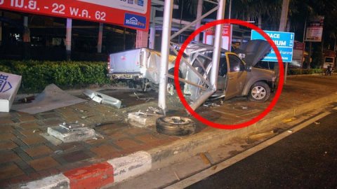 ถนนลื่นพนักงานโรงแรมซิ่งกระบะชนเสาป้ายบอกทางพังยับ