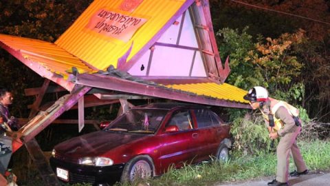 สองหนุ่มเมาซิ่งเก๋งแหกโค้งชนศาลาพักผู้โดยสารพัง