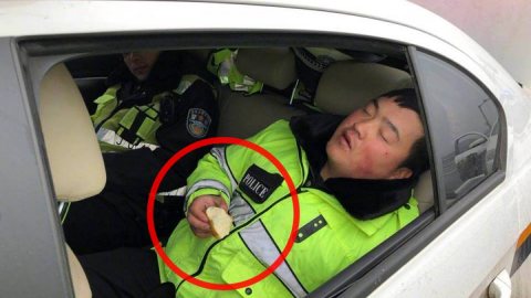 ความภูมิใจของคนจีน!ตำรวจเหนื่อยจนหลับในท่าถือขนมปัง