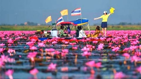 สวยงามละลานตา! นักท่องเที่ยวแห่ชมบัวแดง บานสะพรั่งเต็มทะเลสาบอุดรฯ