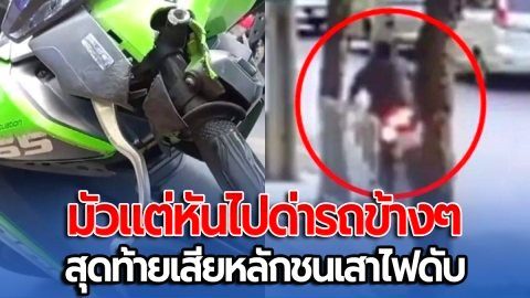 อนาถใจ! หนุ่มใหญ่ขี่มอไซค์ หันไปด่ารถข้างๆ เสียหลักชนเสาไฟดับ