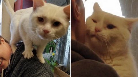 แมวไร้บ้านกระโดดขึ้นไหล่และกอดสาวไม่ปล่อย จนเธอถูกชะตารับไปเลี้ยงทันที