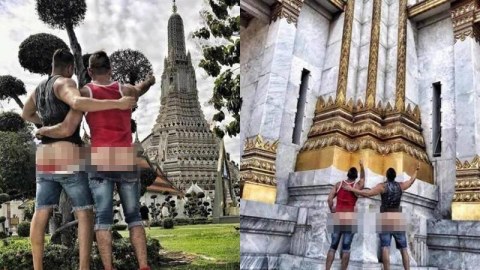 อุบาทว์มากนักท่องเที่ยวชาวเกย์!! โซเชียลระอุ 2 ฝรั่งโชว์บั้นท้ายถ่ายรูปคู่พระปรางค์วัดอรุณ