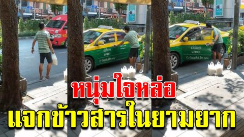 หนุ่มใจหล่อ ยืนโบกแท็กซี่ทุกคัน ก่อนยื่นข้าวสารถุงใหญ่ให้