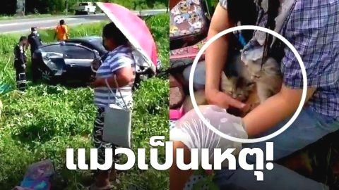 แมวเป็นเหตุ! สาวก้มจับน้องแมว ตอนขับรถ สุดท้าย รถพุ่งชนเสาไฟพลิกคว่ำ