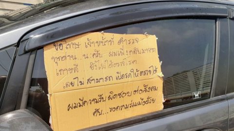 เจ้าของเก๋งดำ เขียนป้ายฝากถึงตำรวจทุกด่าน ไม่มีทางเปิดรถให้เป่าวัดแอลกอฮอล์
