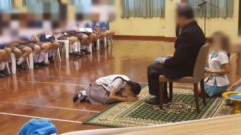 พ่อแม่ตั้งคำถาม พิธีมอบใบประกาศเด็กป.6 ให้กราบเท้าเจ้าของโรงเรียน