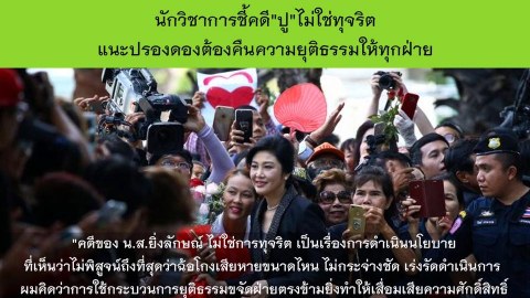 เพจคนรักอดีตนายก ปู อ้างคำกล่าวนักวิชาการ คดี ปู ไม่ใช่ทุจริต พิสูตรยังไม่กระจ่างชัด จะเอาผิดอย่างเดียว ไม่เป็นธรรม แค่อยากขจัดฝ่ายตรงข้าม