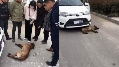 หมาจรจัดไม่ยอมลุกไปไหน นอนขวางรถยนต์ จนชาวบ้านนึกว่าถูกชน