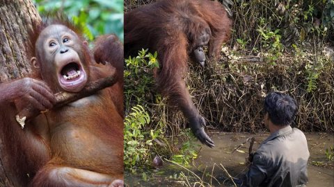 อุรังอุตังเอื้อมมือเข้าช่วยผู้พิทักษ์ป่า หลังเขาลงไปสำรวจงูในแม่น้ำของเกาะบอร์เนียว