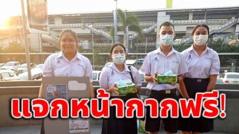 กลุ่มนักเรียนรวมกลุ่มทำความดี ยืนแจกหน้ากากอนามัยฟรีให้กับประชาชน