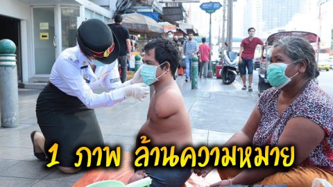 ทหารหญิงนั่งสวมหน้ากากอนามัย ให้ชายขอทานพิการไร้แขน - ขา ไม่รังเกียจ