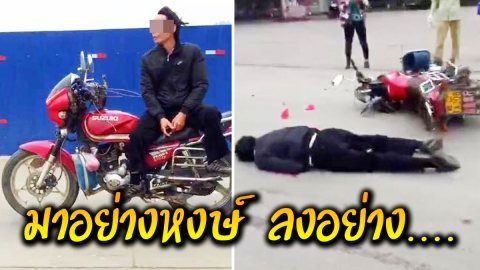 หนุ่มโชว์ขับมอเตอร์ไซค์โลดโผน ปล่อยมือ แถมมีเอนตัวนอน สุดท้ายกลิ้งไม่เป็นท่า