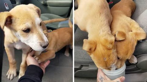 ชายหนุ่มเจอลูกหมาสองตัววิ่งเข้ามาหา ระหว่างขับรถผ่านทะเลทรายอันร้อนระอุ