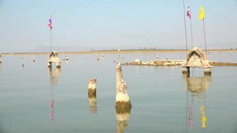 ภัยเเล้งน้ำลด ซากอุโบสถโผล่ชัดเจน ชาวบ้านเเห่กราบไหว้