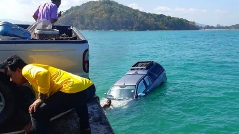 เห็นเต็มๆตาแต่ช่วยไว้ไม่ได้ หนุ่มเอารถขึ้นเรือข้ามฟากไปเที่ยวเกาะ แต่หล่นลงทะเล
