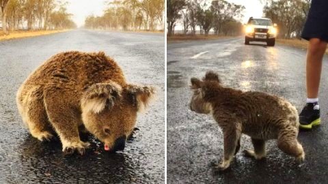 โคอาล่าออกมาดื่มน้ำฝนกลางถนนหลังเกิดไฟป่า ถึงดูน่ารักแต่ก็อันตรายไม่น้อย
