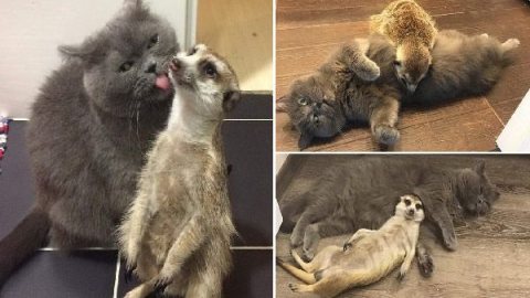 เมียร์แคตกับแมวก็เป็นเพื่อนสนิทกันได้ หลังเจ้าของจับเลี้ยงด้วยกันตั้งแต่เกิดจนโต