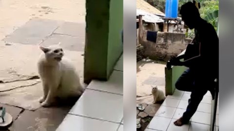 น่ารักอ่ะ หนุ่มดีดกีตาร์ เจ้าเหมียวทนไม่ไหวขอร้องเพลงด้วย