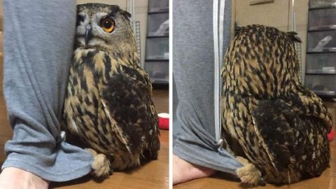 นกฮูกอายสุดๆซ่อนหลังขาเจ้าของ แถมเอาเล็บจิกกางเกง เมื่อเจอเพื่อนบ้านหน้าใหม่เข้ามาทักทาย