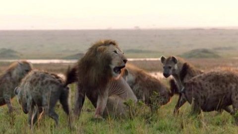 สิงโตหนุ่มกำลังถูกไฮยีน่ากว่า 20 ตัวรุม กระทั่งพี่ชายได้ยินเสียงร้อง จึงรีบวิ่งเข้ามาช่วยอย่างกับพระเอก