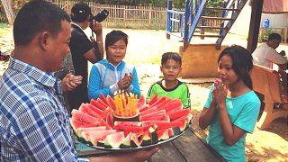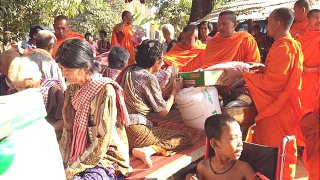 พระภิกษุสงฆ์กัมพูชาจังหวัดกัณดาร นำยา'อาหาร'เครื่องนุ่งห่มไปแจกจ่ายให้กับคนยากจน
