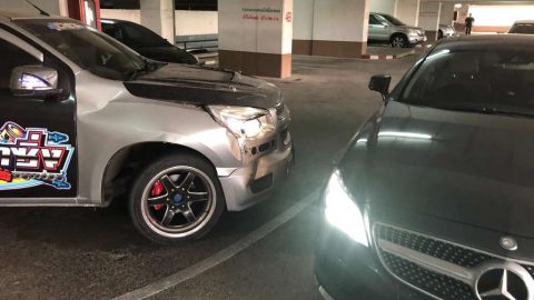 กระบะไม่มีประกันซิ่งลงตึกจอดรถ ไปชนกับรถหรู จ่ายเละแน่ๆงานนี้