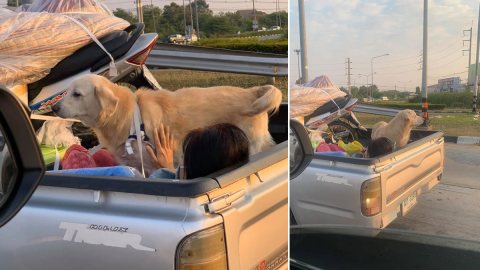 ใครเห็นก็อดเอ็นดูไม่ได้ กับภาพน้องหมายืนตัวเกร็งรับลมท้ายกระบะ กลับบ้านปีใหม่