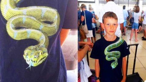 ฝรั่งดราม่า เด็กชายวัย 10 ขวบ ถูกสั่งให้ถอดเสื้อที่มีรูปงู ก่อนขึ้นเครื่องบิน เพราะกลัวผู้โดยสารคนอื่นๆแตกตื่น