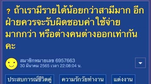 ถ้ามีรายได้น้อยกว่าสามีมาก อีกฝ่ายควรจะรับผิดชอบค่าใช้จ่ายมากกว่า หรือต่างคนต่างออกเท่ากัน