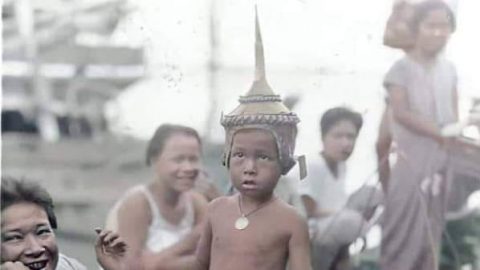 ภาพถ่ายโดยชาวต่างประเทศ เด็กหญิงไทยใส่ ตะปิ้ง สวม ชฎาทำจากใบลาน ร่ายรำอยู่ในตลาดแห่งหนึ่งในกรุงเทพ คศ. 1927 (พ.ศ.2470) ช่วงรัชกาลที่7
