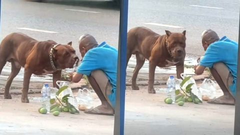 ลุงเเปลกหน้าใจดี นั่งป้อนหมูทอดให้พิทบูลหน้าเเปลกอย่างอ่อนโยน น่ารักมาก