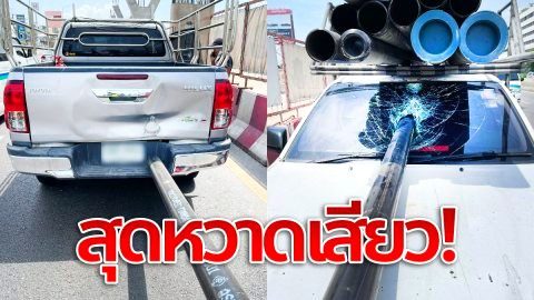 สยองสุดๆ ปิกอัพเบรกแรง เหล็กหลุดกระแทกรถคันหน้า อีกด้านทะลุกระจกรถตัวเอง