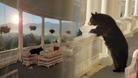 น่าฮักมาก หมีหลงทางยืนเกาะระเบียง ดูพระอาทิตย์ขึ้นกลางรีสอร์ท