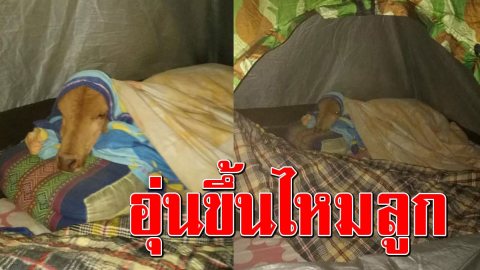 แม่กลัวน้องหนาว พา วัวน้อย นอนร่วมเต็นท์ ห่มผ้านวม ให้ความอบอุ่น