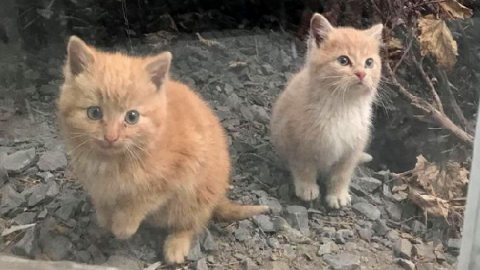 ลูกแมวจรจัดสองตัวผลุบๆโผล่ๆจากพุ่มไม้ และมาขออาศัยอยู่กับมนุษย์แบบแพคคู่