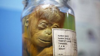ภาพน่าเศร้าของ"ลูกลิงอุรังอุตัง"ตัวน้อยที่ถูกดองไว้ในโหลเพื่อการศึกษา ใจกลางอินโดนีเซีย