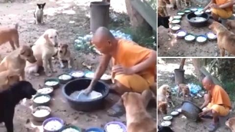 คลิปน่ารัก หลวงพ่อตักอาหารให้น้องหมา นั่งรอกันเป็นระเบียบสุดๆ