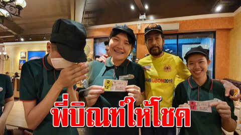 ‘พี่บิณฑ์’ ให้โชค แจกลอตเตอรี่พนักงานร้านพิซซ่า