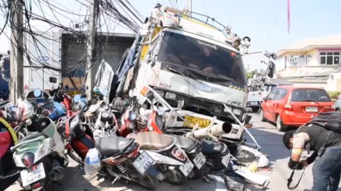 รถบรรทุก6 ล้อ เสียหลัก!! กวาดเรียบจักรยานยนต์จอดข้างทาง11คัน